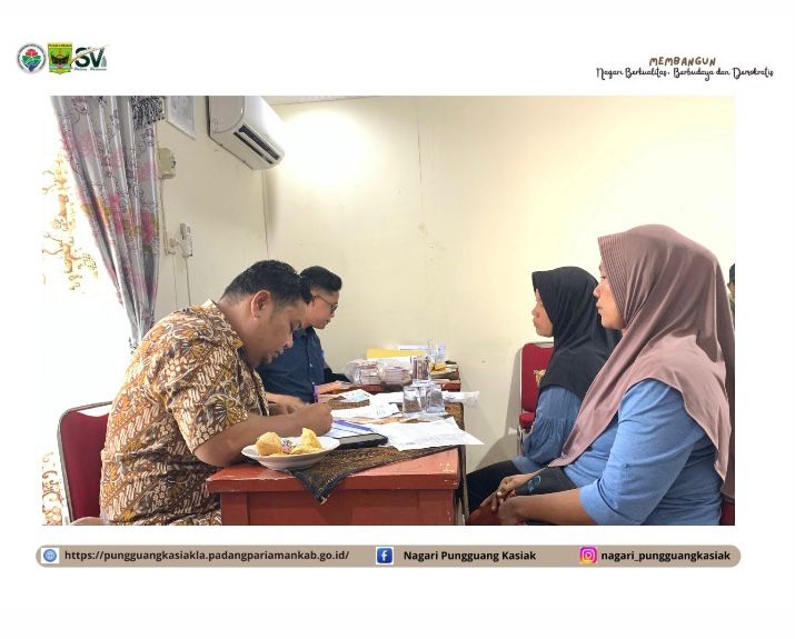 Pungguang Kasiak, Kamis (4/9/2025) – Pemerintah Nagari Pungguang Kasiak Lubuk Alung, melaksanakan kegiatan pembuatan rekening bagi penerima Bantuan Sosial (Bansos) Tahun 2025. Kegiatan ini berlangsung di Kantor Nagari Pungguang Kasiak mulai pukul 09.00 WIB hingga selesai, dengan dihadiri langsung oleh Wali Nagari beserta Perangkat Nagari, perwakilan Bamus, pendamping PKH, perwakilan Bank BRI, serta masyarakat penerima manfaat.